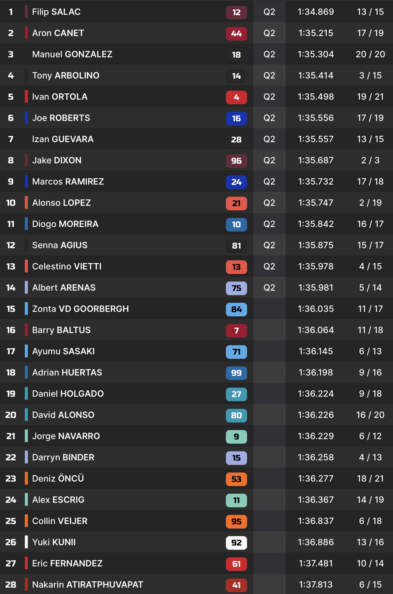 Dans la cohue, Filip Salac parvient à signer un chrono en 1:34.869 pour se mettre devant. Aron Canet et Manuel Gonzalez complètent le top-3. Le classement final est plutôt surprenant. Hors du top-14, on retrouve les deux pilotes Aspar, David Alonso et Dani Holgado, mais aussi Barry Baltus et Deniz Öncü. Tous ces pilotes devront passer par la Q1, où quatre places seront encore disponibles pour la suite des Qualifications.