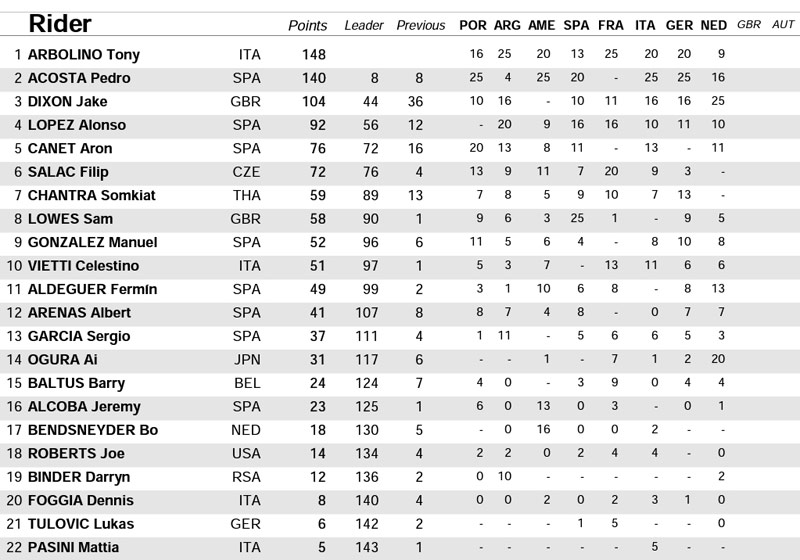 Le pilote britannique Jake Dixon, né à Douvres en janvier 1996, remporte sa première victoire dans la catégorie Moto2 et se hisse à la troisième place du classement juste avant la pause estivale.