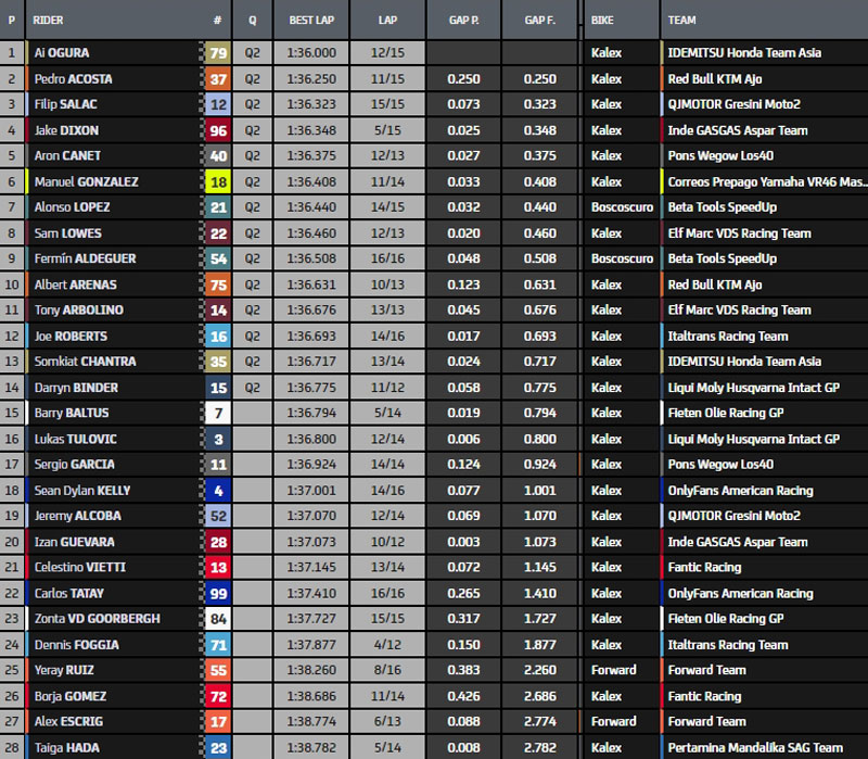 Ai Ogura (Team Asia) revient aux premières places en terminant quatrième devant Sam Lowes (Marc VDS), Albert Arenas (Red Bull Ajo) et son coéquipier Somkiat Chantra. Toujours dans le Top Ten, le leader du Championnat du Monde Tony Arbolino (Marc VDS), qui « s’arrête » à un peu plus d’une demi-seconde du sommet, exactement 0,535s devant Barry Baltus (RW Racing GP) et Sergio Garcia (Pons). Fermin Aldeguer, Aron Canet, Filip Salac et Joe Roberts se sont également qualifiés pour la Q2 provisoire.