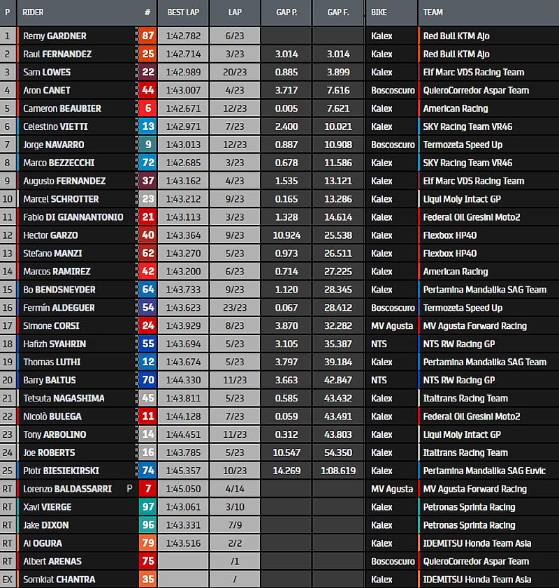 Encore 3 tours et les positions des leaders sont inchangés : Gardner devant R.Fernandez ( à 1.855s), Lowes, Beaubier, Canet, Vietti, Bezzecchi, Navarro, A.Fernandez et Di Giannantonio.
