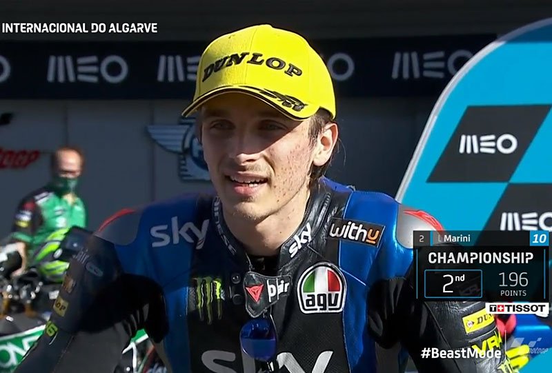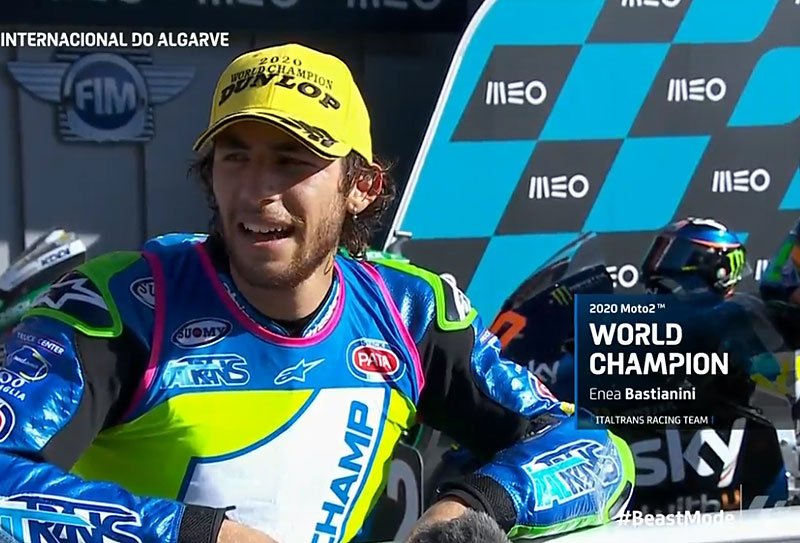Enea Bastianini (5e et Champion du monde) : « C’est incroyable pour moi. La saison a été fantastique mais très difficile avec la Covid. Aujourd’hui je suis Champion du monde, c’est incroyable. Merci à mon équipe, ma famille, ma copine, mon entraîneur, c’est une journée fantastique pour moi, c’est le plus beau jour de ma vie. Même ma moto est très contente ! J’avais une très bonne moto, pas pour gagner mais j’ai terminé cinquième et c’était assez pour le titre. »