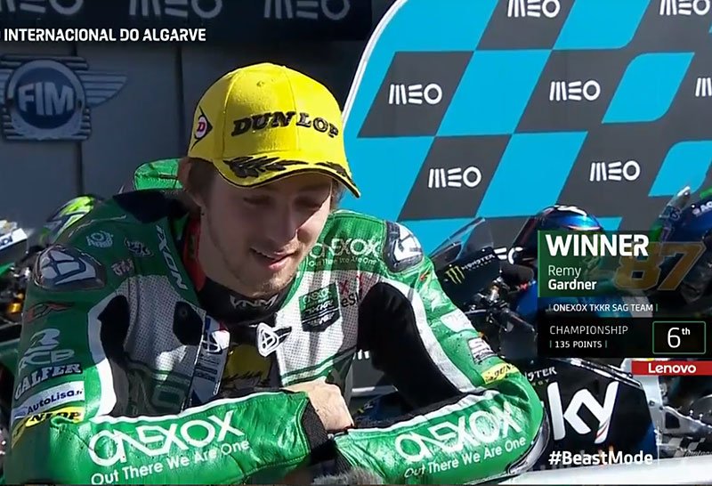 Remy Gardner (1er) : « Je ne sais pas quoi dire, c’est ma première victoire, c’est un peu émouvant. On a été forts tout le week-end. Je pensais en venant ici que je pouvais gagner et j’y ai pensé de plus en plus et je ne voulais pas terminer sans cette victoire. On a toujours bien travaillé et dans les derniers tours je savais que j’avais le rythme pour revenir et doubler. Je suis passé et j’ai donné tout ce que j’avais pour m’échapper. »