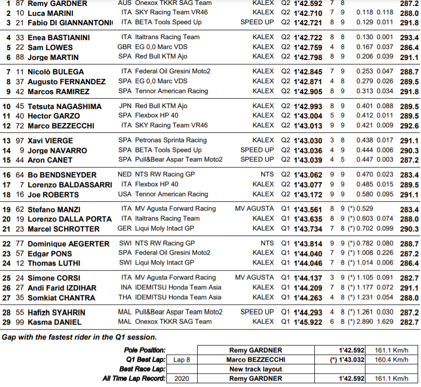 Cette séance de qualifications se déroulera en feux temps: une séance de Q1 de quinze minutes où quatre pilotes seront repêchés pour aller se battre avec les quatorze pilotes (Remy Gardner, Hector Garzo, Marcos Ramirez, Luca Marini, Aron Canet, Augusto Fernandez, Enea Bastianini, Xavi Vierge, Fabio Di Giannantonio, Sam Lowes, Joe Roberts, Tetsuta Nagashima, Lorenzo  Baldassari et Jorge Navarro) qui sont déjà qualifiés ce matin pour la Q2.