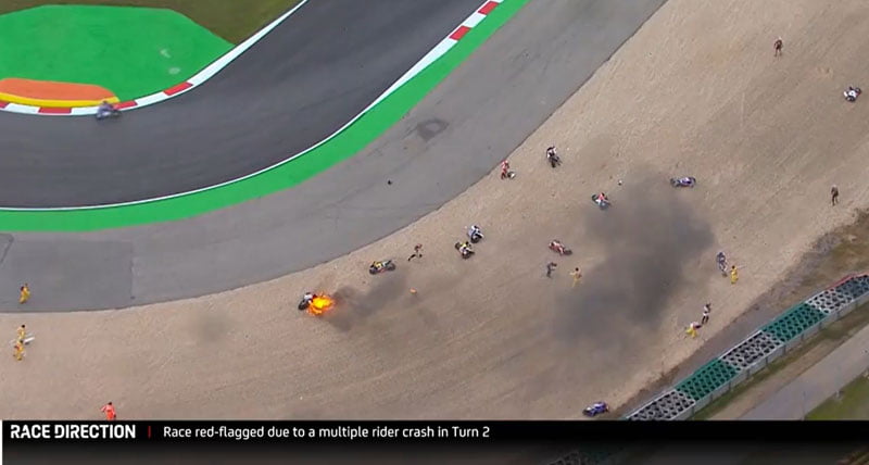 La course repartira pour 7 tours au lieu des 15 prévus mais nombre de machines sont très abîmées et ne seront sans doute pas réparées à temps. De plus, en application de la réglementation, seuls les pilotes  et les motos ayant réintégrés le paddock dans les cinq minutes pourront repartir.