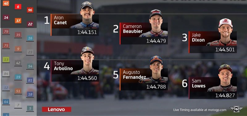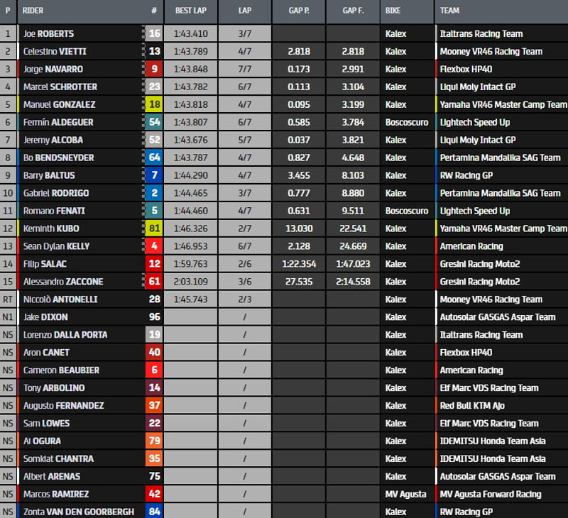 La première ligne sera donc composée de Jake Dixon (GasGas, GasGas Aspar Team, #96), Joe Roberts (Kalex, Flexbox HP40, #9) et Celestino Vietti, la deuxième de Jorge Navarro (Kalex, Flexbox HP40, #9), Fermín Aldeguer (Boscoscuro, Speed Up Racing, #54) et Jeremy Alcoba (Kalex, Liqui Moly Intact GP, #52). Seuls 18 pilotes prendront part au deuxième départ sur les 30 participants à la première partie de course.