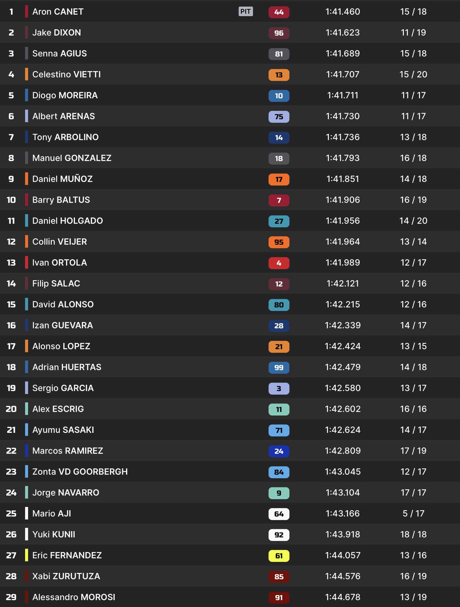 À 5 minutes de la fin du temps imparti, une chute de Collin Veijer au virage 4 freine légèrement les pilotes dans leur élan. Cela n’empêche pas Aron Canet de s’emparer de la référence lors de la tentative suivante. Il tourne alors en 1:41.460, et établit un nouveau record de la piste.