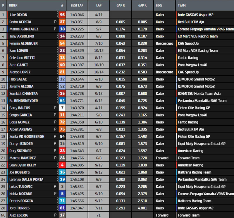Pour mémoire, le top10 est le suivant alors que le temps tourne (8min restantes) et que les pilotes ne reprennent pas la piste : Dixon en 1.43.046s, Acosta, Gonzalez, Arbolino, Aldeguer, Lowes, Vietti, Lopez, Salac et Alcoba.