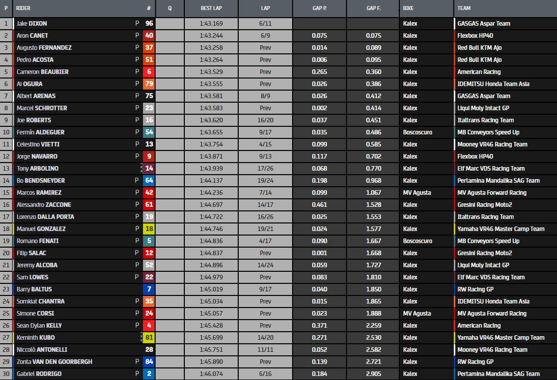 La première journée d’essais sur le circuit portugais s’est terminée avec la nouvelle recrue du team Aspar, Jake Dixon, comme pilote le plus rapide de la journée, grâce à son temps de 1’43.169 lors de la dernière des trois séances de la journée. Le temps du Britannique, qui est toujours à une seconde du record du circuit portugais, lui a permis de mener la journée pour son quatrième jour avec l’équipe espagnole, devant un trio vraiment très proche au chrono…