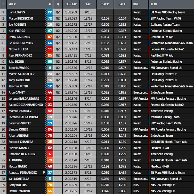 Dixon est neuvième. Canet est 14ème et donc dernier dans le wagon a destination de la Q2. Baldassarri est le premier déçu alors que Di Giannantonio semble aussi promis à la Q1…