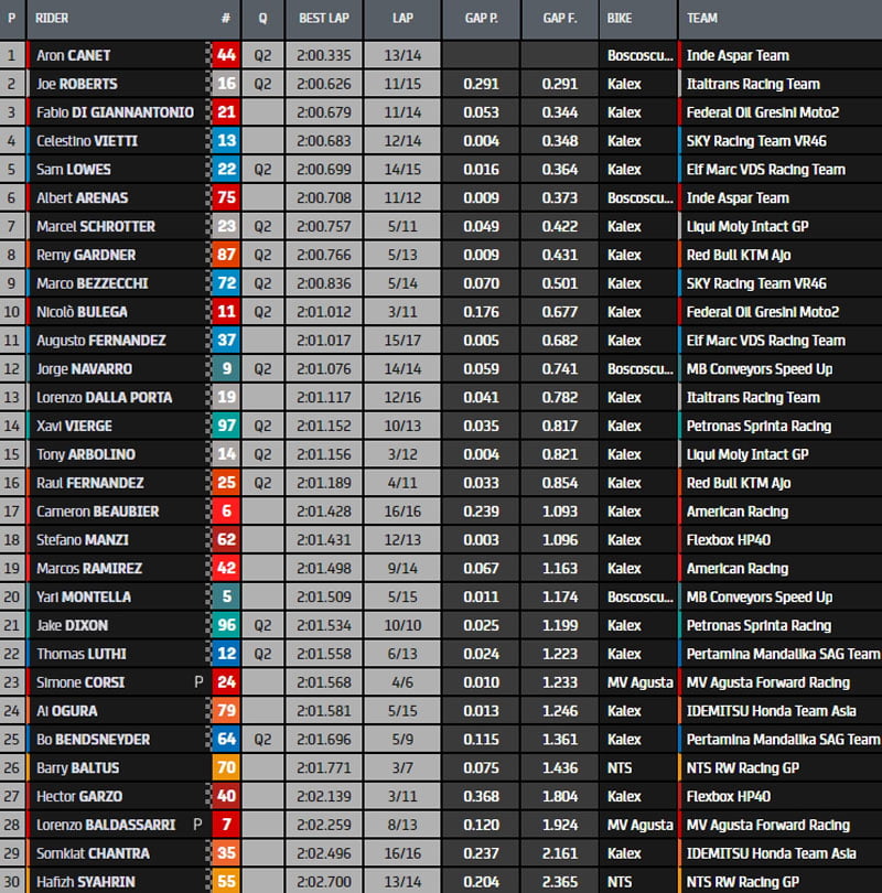 Les positions évoluent peu si ce n’est Schrotter qui vient s’emparer du 2e meilleur temps en 2.00.757s. Gardner, Bezzecchi, et Roberts ferment la marche du top5. Arenas, le champion du monde en titre est 7e il tourne en 2.00.927s.