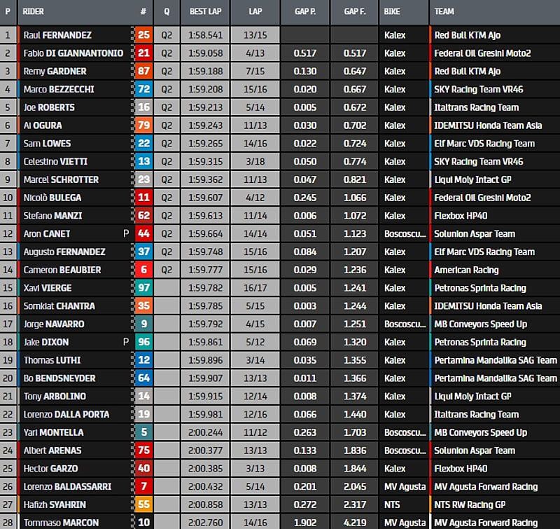 Sous le drapeau à damier, Raul Fernandez garde son avantage devant Di Giannantonio et Remy Gardner encore battu par son jeune équipier. Bezzecchi et Roberts sont dans le top 5. Ogura est sixième devant Sam Lowes. Vietti, Schrotter et Bulega sont dans le top 10. Le top 14 est bouclé par l’Américain Beaubier qui repousse donc provisoirement Xavi Vierge dans la Q1. Jake Dixon, 18e y sera aussi ainsi que Bendsneyder.