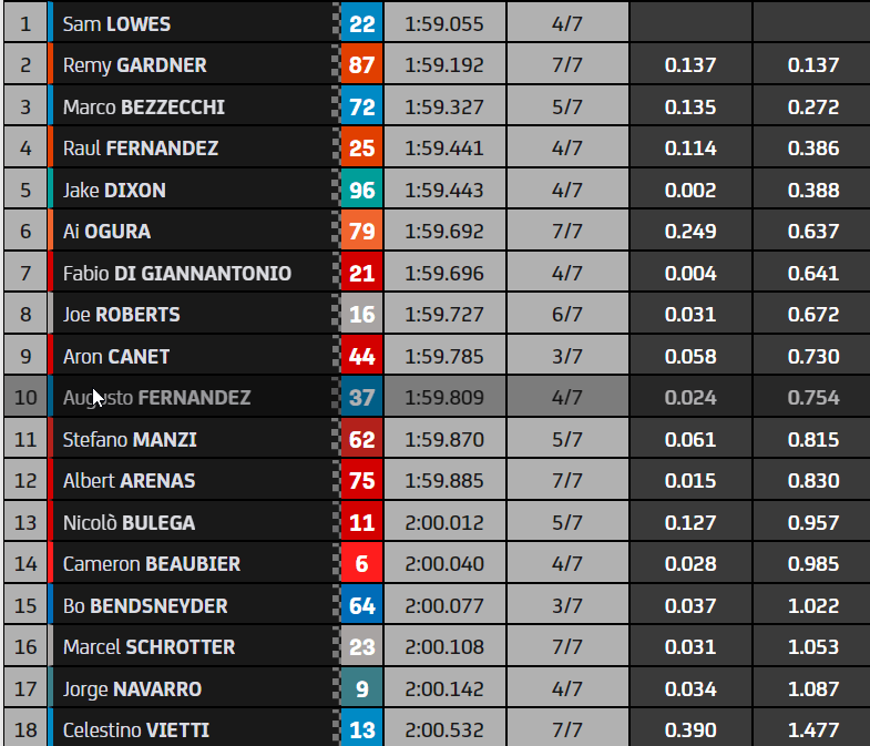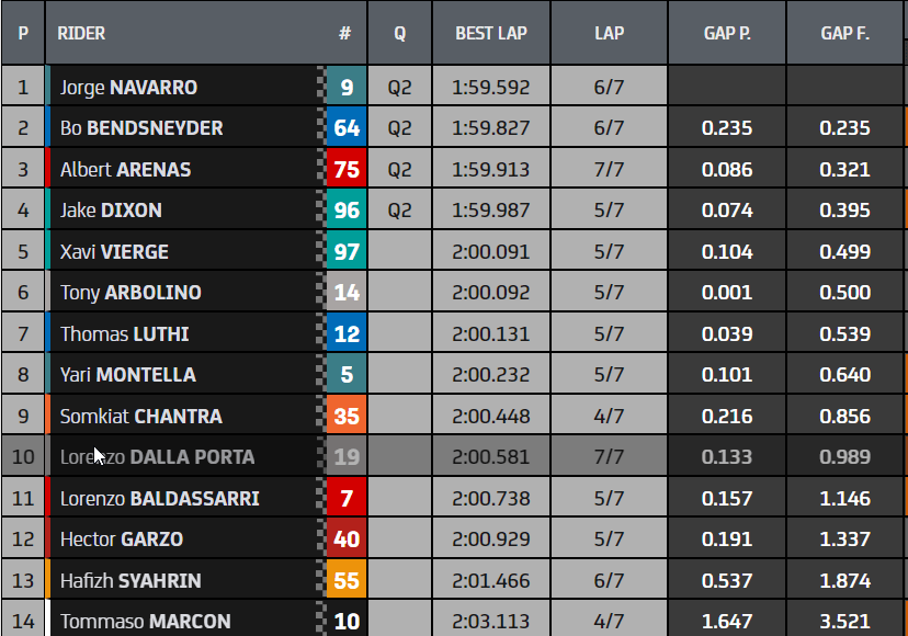 Celestino Vietti (Sky Racing Team VR46), Marcel Schrötter (Liqui Moly Intact GP) et Nicolò Bulega (Federal Oil Gresini Moto2) se maintenaient de la même façon au sein du Top 10. Stefano Manzi (Flexbox HP40), Arón Canet (Solunion Aspar Team), Augusto Fernández (ELF Marc VDS Racing) et Cameron Beaubier (American Racing) sont les derniers qualifiés d’office pour la Q2.