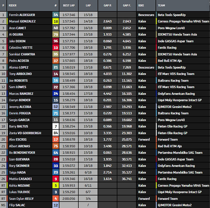 La fin de course est animée par les dépassements entre Aron Canet et Manuel Gonzalez d’un côté, Ai Ogura et Jake Dixon de l’autre.