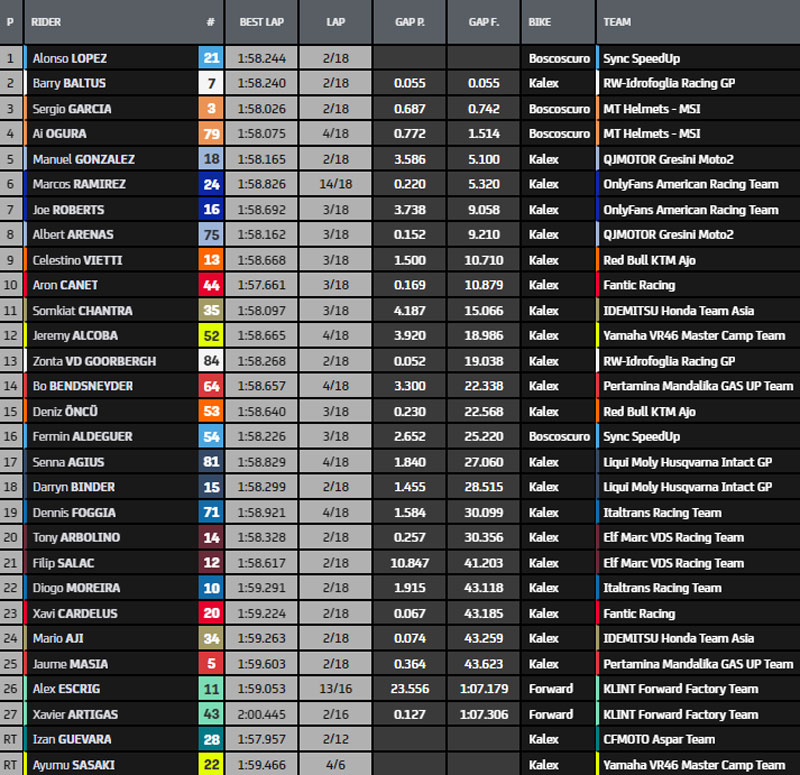 Pénalisé de trois places sur la grille de départ pour avoir gêné un pilote durant les Essais, Fermin Aldeguer (SpeedUP), chute dans la hiérarchie et se retrouve en 13e position après seulement trois tours. L’Espagnol gagnera vite des places, réalisant même un triple dépassement en un virage, qu’il perdra à nouveau par la suite. Auteur d’une course anonyme, Aldeguer franchit le drapeau à damier en 16e position. C’est aussi le cas d’Arbolino qui commet une erreur avant de chuter au 14e rang (20e à l’arrivée).