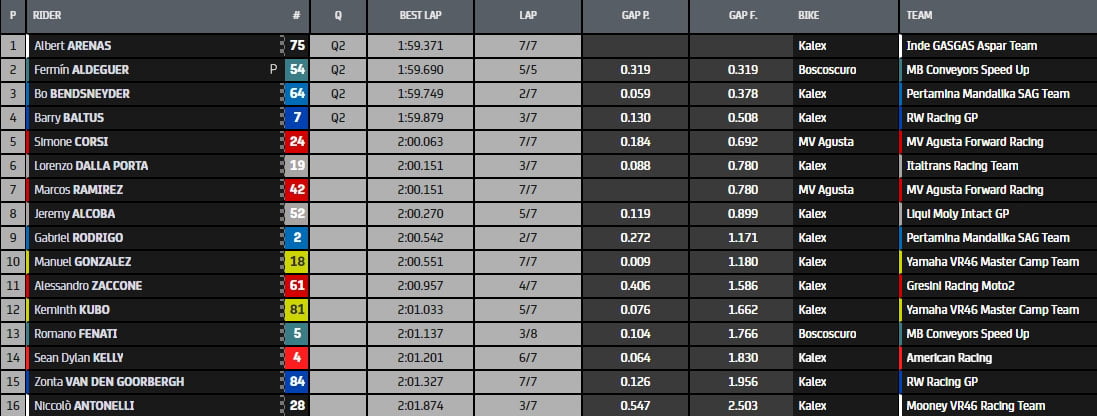Arenas reprend la tête de ce groupe et termine leader de cette Q1 avec son chrono en 1.59.371s. Aldeguer, Bendsneyder et Baltus sont les 3 autres pilotes qualifiés pour aller chasser la pole position en Q2.
