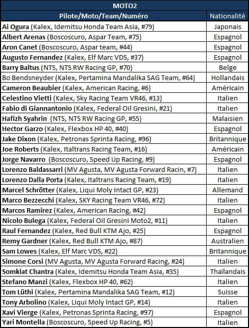 Il notera également les pilotes qui ont changé d’équipe, dont Lorenzo Baldassarri (MV Agusta, MV Agusta Forward Racin, #7), Hafizh Syahrin (NTS, NTS RW Racing GP, #55), Fabio Di Giannantonio (Kalex, Federal Oil Gresini, #21) et Stefano Manzi (Kalex, Pons HP 40, #62).