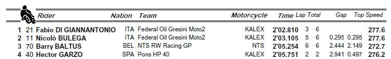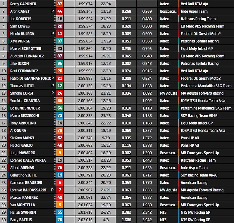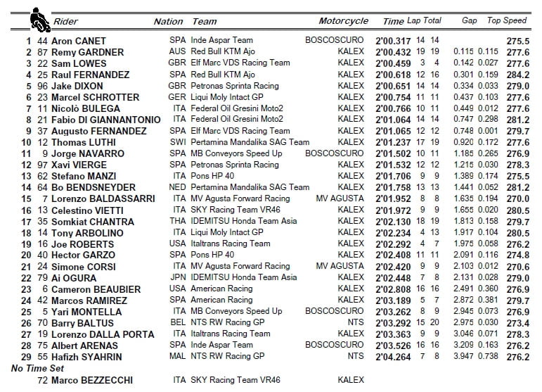 Bien que ne franchissant pas la barre des deux minutes, Arón Canet (Speed Up, Aspar team, #44) s’est imposé devant deux pilotes expérimentés, Remy Gardner (Kalex, Red Bull KTM Ajo, #87) et Sam Lowes (Kalex, EG 0,0 Marc VDS, #22), mais c’est bien le rookie Raúl Fernández (Kalex, Red Bull KTM Ajo, #25) qui s’est mis en valeur, en se positionnant 4e à 3 dixièmes.