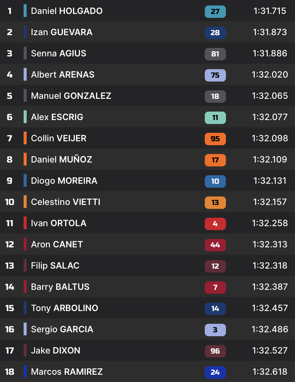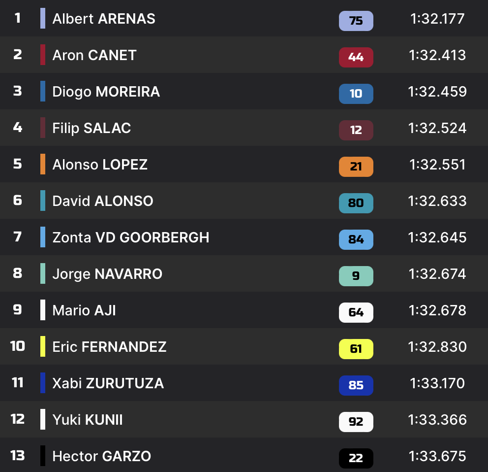 L’un d’entre eux s’est d’ailleurs fait piégé devant le drapeau à damier. Alors qu’Albert Arenas signait le meilleur temps de la Q1, en 1:32.177, Aron Canet et Diogo Moreiera complètent le top-3, devant Filip Salac, dernier qualifié pour la Q2. David Alonso, en revanche, n’y est pas parvenu, recalé pour moins d’un dixième.