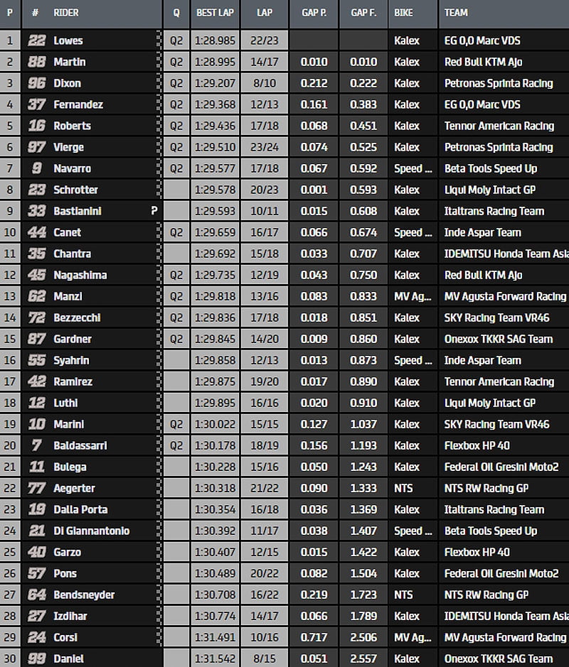 Martin à 4min du terme de la séance reprend la main en réalisant le meilleur chrono en 1.29.405s devant Schrotter et Bastianini. Lowes et Vierge composent le top5. Lowes poursuit son effort et prend le leadership avec un chrono en 1.29.057s mais il est repris de suite par Martin en 1.28.995s.