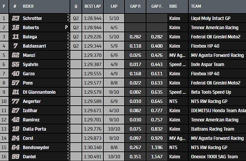 En plus des pilotes susmentionnés, Jake Dixon, Augusto Fernández et Jorge Martin entraient également directement en Q2. Sont contraints au «piège» de Q1 entre autres : Stefano Manzi, Joe Roberts, Marcel Schrotter, Nicolò Bulega et Lorenzo Baldassarri. Pour donner une idée de combien la séance a été disputée, il suffit de penser que le top 16 est enfermé en une demi-seconde et cela annonce des qualifications enflammées. Justement les voici. Avant de s’y consumer, voici le tableau qui résume les faits…