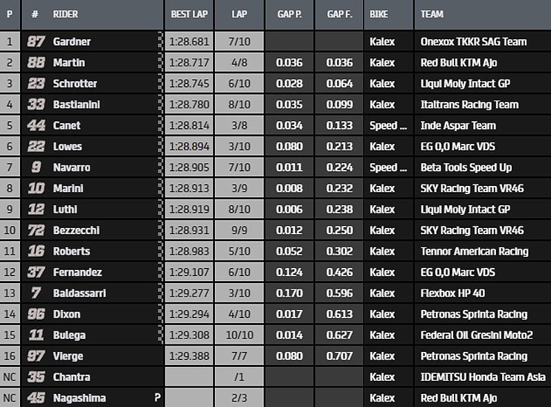 Martin passe à l’offensive et récupère le leadership de la session en signant un chrono en 1.28.717s. Il devance Bastianini et Canet. Gardner et Lowes composent le top5.