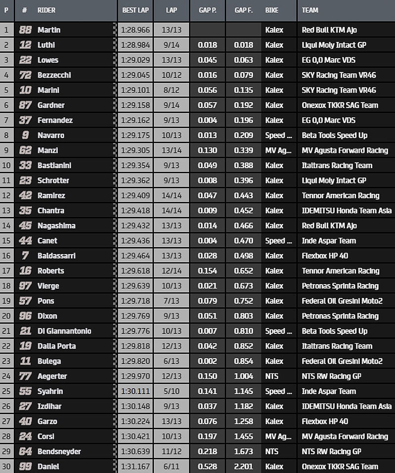 C’est Martin qui vient se positionner au 1e rang en signant le chrono de référence de cette session en 1.30.338s. Gardner se réattribue ce chrono en 1.29.764s mais il est repris par Martin en 1.29.717s. Tour à tour, Luthi puis Bezzecchi gagne encore quelques centièmes sur ce chrono mais c’est Bezzecchi qui vient se placer sur le haut du panier en réalisant un temps au tour en 1.29.357s. Martin pour 2 millièmes s’empare à son tour du meilleur temps en 1.29.357s. Les 4 premiers se suivent en 34millièmes.