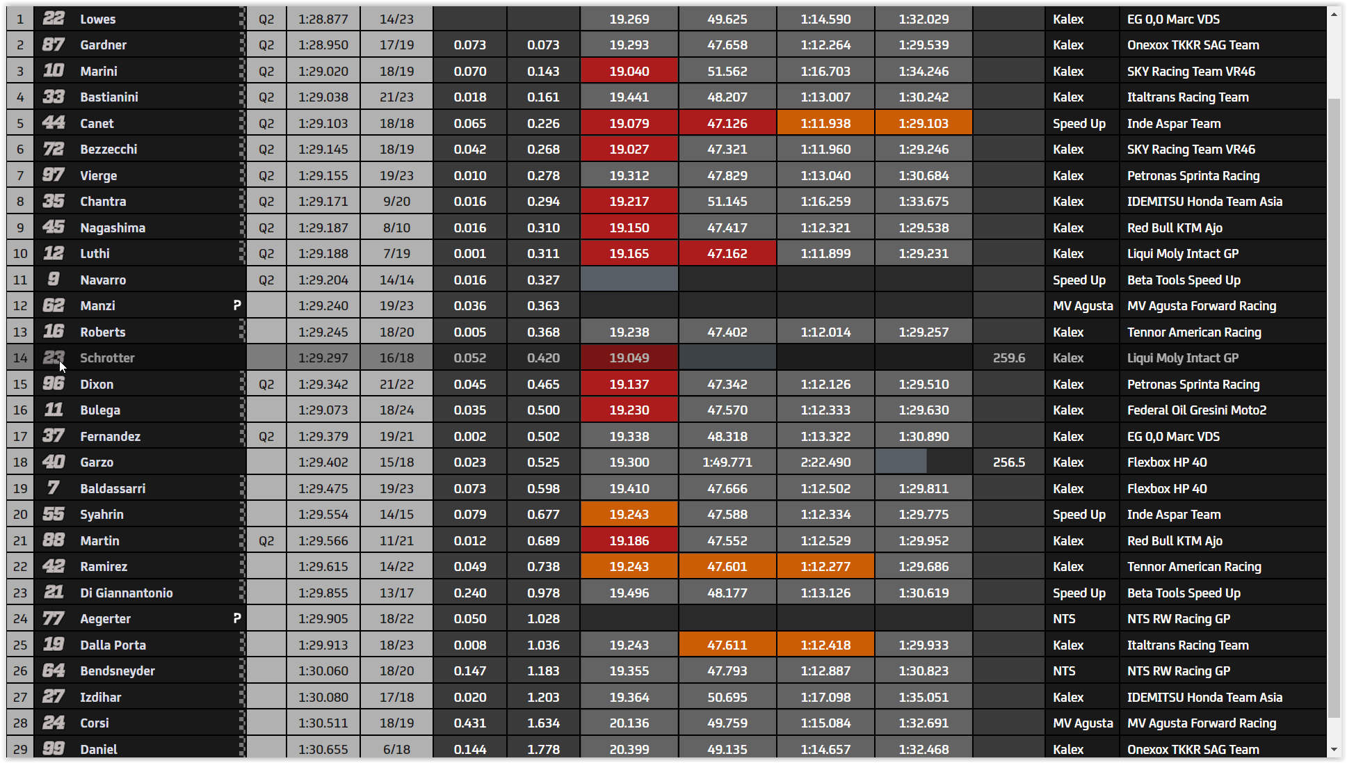 Voici la liste provisoire des 14 pilotes qui intègreront directement la Q2 alors qu’il reste 13min avant le fin de la séance : Lowes, Martin, Marini, Bezzecchi, Chantra, Fernandez, Luthi, Dixon, Navarro, Schrotter, Gardner, Canet, Nagashima et Roberts. Bastianini est à la porte de la Q2, il est 15e.