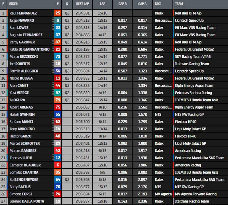 Sous le drapeau à damier, Raul Fernandez garde la tête devant Navarro, Sam Lowes, Augusto Fernandez et Remy Gardner. Di Giannantonio mène le reste de la meute. Bezzecchi, Joe Roebrts, Bulega et Canet ferment le top 10. Arenas boucle le top 14 qui décide de l’entrée d’office en Q2.