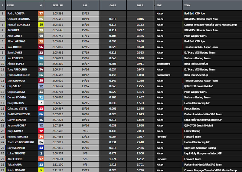 A 17min du finish, le top10 se compose de : Chantra, Acosta, Dixon, Aldeguer, Roberts, Arbolino, Salač, López, Canet et Arenas.