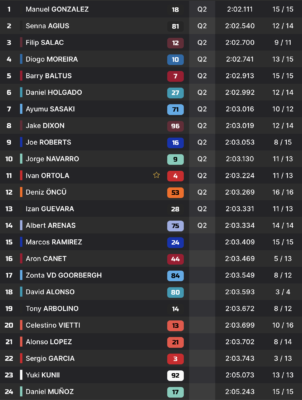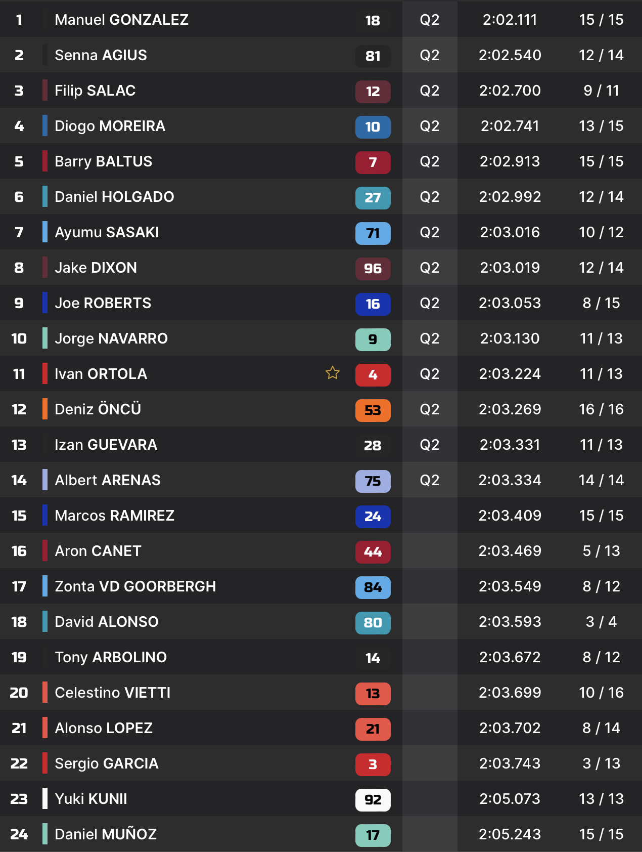 Si Barry Baltus (5e) et Jake Dixon (8e), se qualifient pour la Q2. Aron Canet est le grand perdant de la journée. Terminant 16e, le pilote Fantic devra passer par la Q1 où il affrontera des pilotes tels que Celestino Vietti et Tony Arbolino.