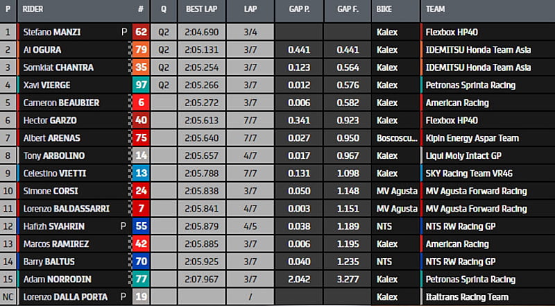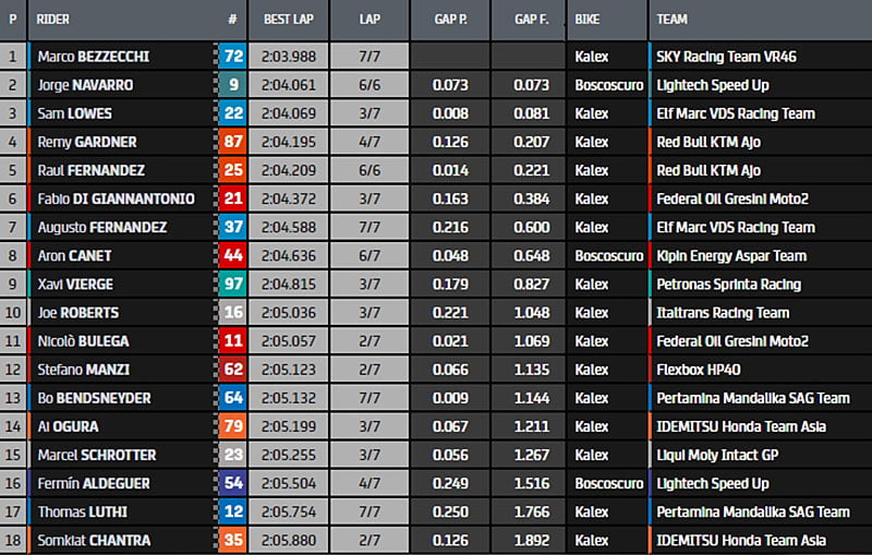 Bezzecchi dans le coup passe la barre des 2.04 et accroche un 2.03.988s. Navarro l’imite et prend la 2e position en 2.04.061s. Lowes est 3e, Gardner et R.Fernandez ferment la marche du top5