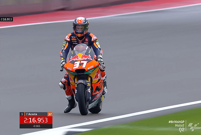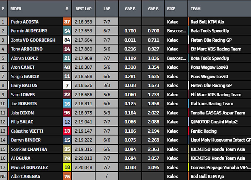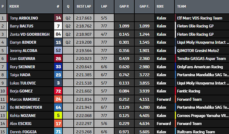 Comme les 13 autres pilotes qui le suivaient au classement de cette P2, cela lui a permis d’accéder directement à la Q2, la P3 s’étant déroulée sur une piste détrempée qui n’a pas permis à Tony Arbolino (Kalex, ELF Marc VDS Racing Team, #14), 1er en P3 mais seulement 15e en P2, de faire partie des 14 privilégiés que sont maintenant Arón Canet, Alonso López (Boscoscuro, CAG SpeedUp, #21), Fermín Aldeguer (Boscoscuro, CAG SpeedUp, #54), Pedro Acosta (Kalex, Red Bull KTM Ajo, #37), Ai Ogura (Kalex, Idemitsu Honda Team Asia, #79), l’idole locale Jake Dixon (Kalex, Inde GASGAS Aspar Team, #96), Joe Roberts (Kalex, Italtrans Racing Team, #16), Albert Arenas (KTM, Red Bull KTM Ajo, #75), Sam Lowes (Kalex, ELF Marc VDS Racing Team, #22), Somkiat Chantra (Kalex, Idemitsu Honda Team Asia, #35), Sergio Garcia (Kalex, Pons Wegow Los40, #11), Manuel González (Kalex, Correos Prepago Yamaha VR46, #18), Celestino Vietti (Kalex, Fantic Racing, #13) et Filip Salač (Kalex, QJMOTOR Gresini Moto2, #12).