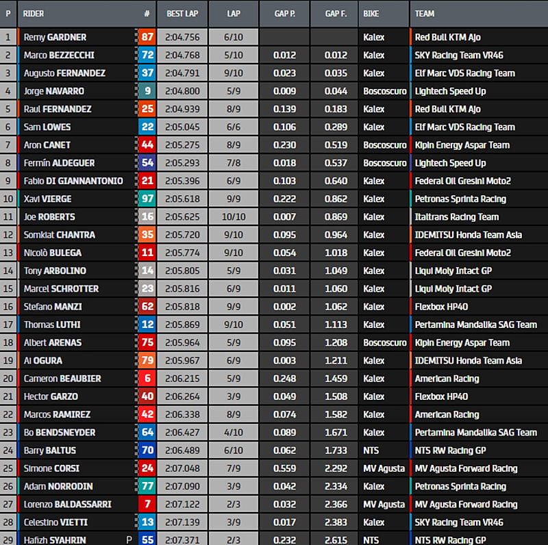 Mais l’Australien se pose en patron, il reprend la main en 2.04.756s. Bezzecchi, A.Fernandez, Navarro, R.Fernandez, Lowes, Canet, Aldeguer, Di Giannantonio et Vierge viennent compléter ce top 10.