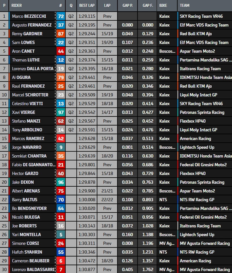 Sous le drapeau à damier, Gardner garde le gain de la séance, mais il est seulement troisième aux chronos cumulés. Bezzecchi reste donc le patron malgré tout. Arbolino est le dernier qualifié potentiel en Q2. Raul Fernandez est seulement neuvième.