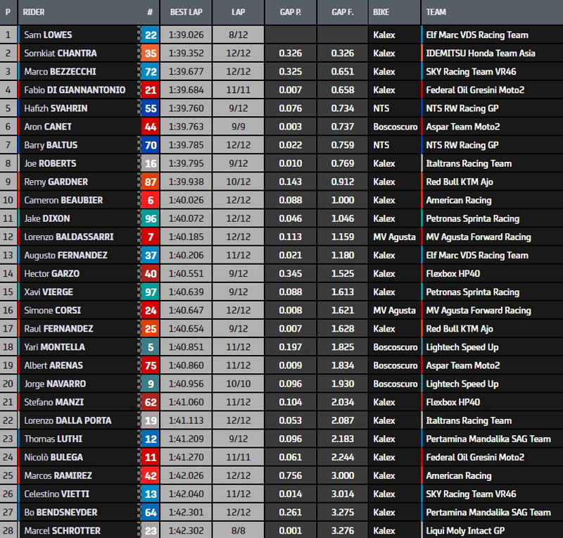 En fin de session, les positons des 5 premiers évoluent: Lowes se maintient aux avants-poste devant Chantra, Bezzecchi, Di Giannantonio et Syarhin.
