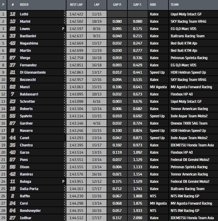 Luca Marini se propulsait en deuxième position en 1’42.502, soit à seulement 0.08 de Lüthi. Ces deux hommes précédaient au final Sam Lowes, Enea Bastianini et le leader du Championnat du Monde Tetsuta Nagashima.