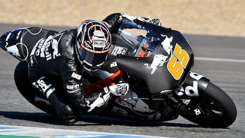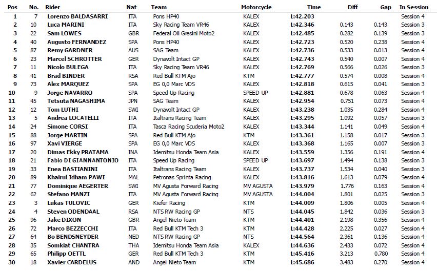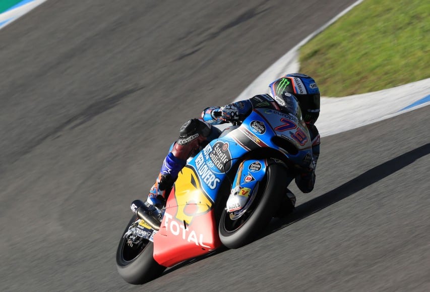 Xavi Vierge, Kalex, EG 0,0 Marc VDS, 16e à 1,165: «  La journée était très excitante du fait de ce nouveau défi, et je dois dire que le moteur Triumph est incroyable. Le couple est fantastique et je peux sentir beaucoup plus de puissance par rapport au moteur que nous utilisons jusque-là en Moto2, surtout quand on ouvre la poignée de gaz à la sortie et qu’on accélère. Nous devons travailler pour adapter la moto à mon style de pilotage, mais je suis content de la façon dont la première journée s’est déroulée. Avec le moteur Honda, il fallait garder beaucoup de vitesse en virage, je pense que le style de pilotage sera désormais plus proche du MotoGP. Il faudra profiter de la sortie des virages pour exploiter le moteur ».