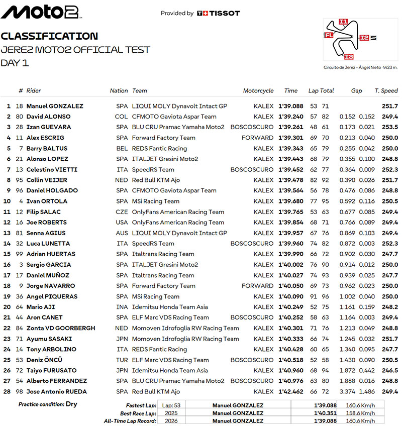 Moto2, Test Jerez J1 : Manuel González écrase tout dès le premier jour, y compris le record !