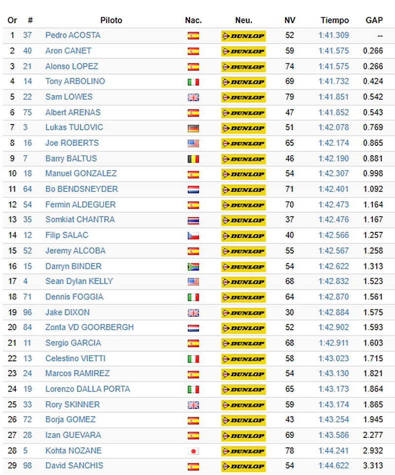 La quatrième place revient à Tony Arbolino (ELF Marc VDS Racing Team) (1’41.732), suivi de Sam Lowes en 1’41.851. Derrière Sam Lowes, Albert Arenas (Red Bull KTM Ajo) prend la sixième place en 1’41.852. Septième, Lukas Tulovic (Liqui Moly Husqvarna Intact GP) en 1’42.078, suivi de Joe Roberts (Italtrans Racing Team) (1’42.174), Barry Baltus (RW Racing GP) (1’42.190) et Manuel González (1’42.307) dans les dix premiers. De son côté, le pilote andalou de Conil de la Frontera, Marcos Ramírez (MV Agusta Forward Team), a terminé à la vingt-troisième place, mais en améliorant son temps de la veille de plus de 5 dixièmes.