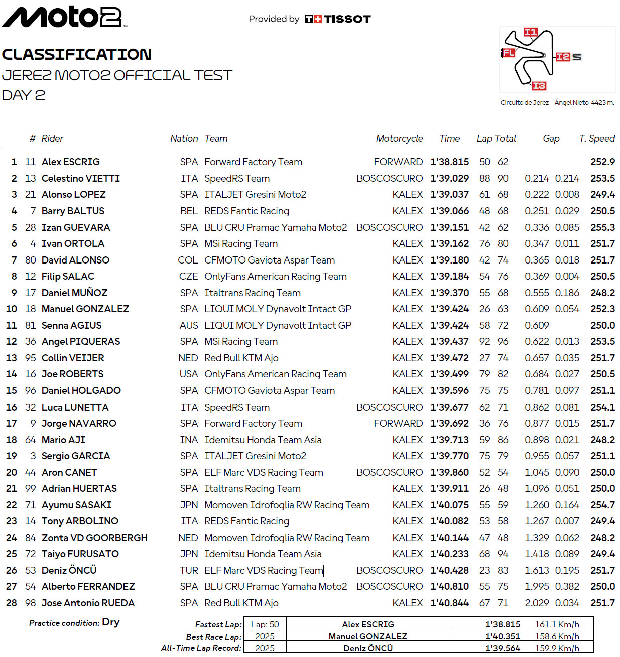 Derrière le Valencien, on trouve l’Italien Celestino Vietti (SpeedRS Team) auteur du deuxième meilleur temps de la journée en 1’39.029, puis un classement très serré avec Alonso López (ITALJET Gresini Moto2) en 1’39.037, Barry Baltus en 1’39.066, etc, jusqu’à la 8e position détenue par David Alonso (CFMOTO Gaviota Aspar Team) !