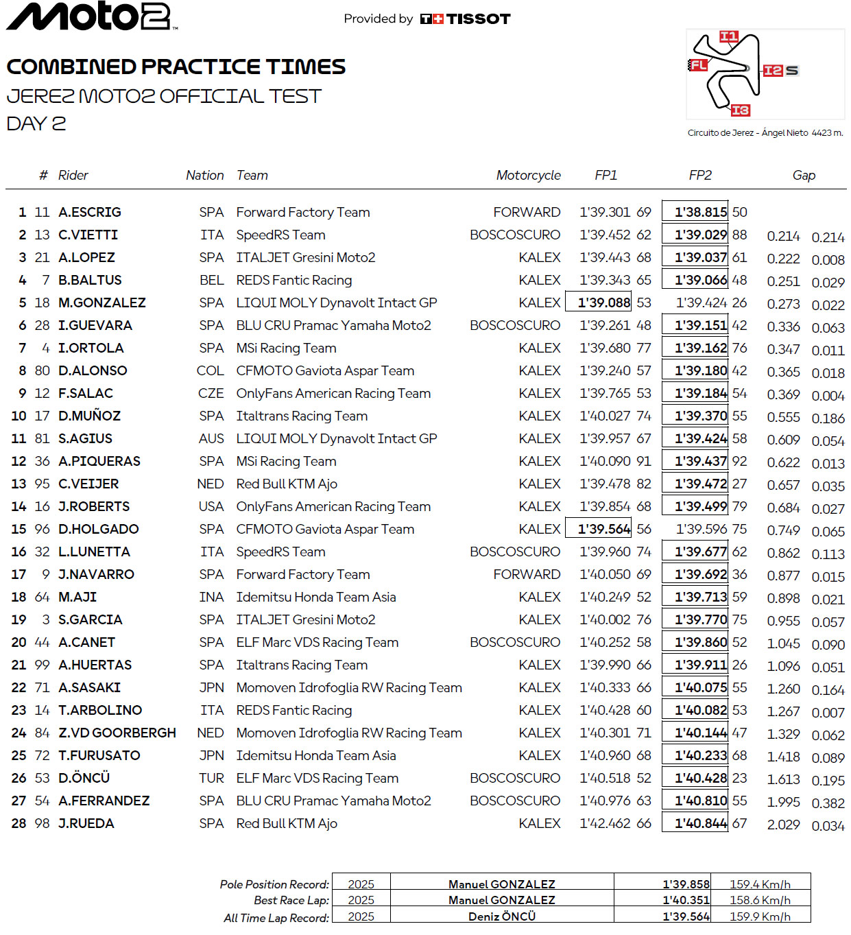 L’évolution de cette catégorie entre l’année dernière et cette année a été spectaculaire à Jerez, un circuit où la meilleure référence en Moto2 était le chrono de 1’39.564 de Deniz Öncü (ELF Marc VDS Racing Team) quand il était chez Red Bull KTM Ajo, qui, en seulement deux jours, a été largement battu par plus de 14 pilotes, effaçant cet ancien record en un clin d’œil pour établir une nouvelle référence qui corrobore l’évolution technique de ces machines sur ce circuit en moins d’un an.