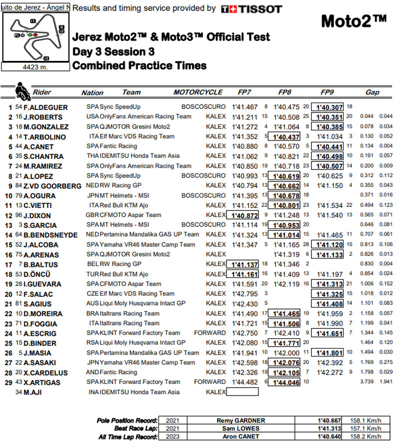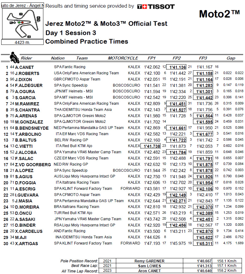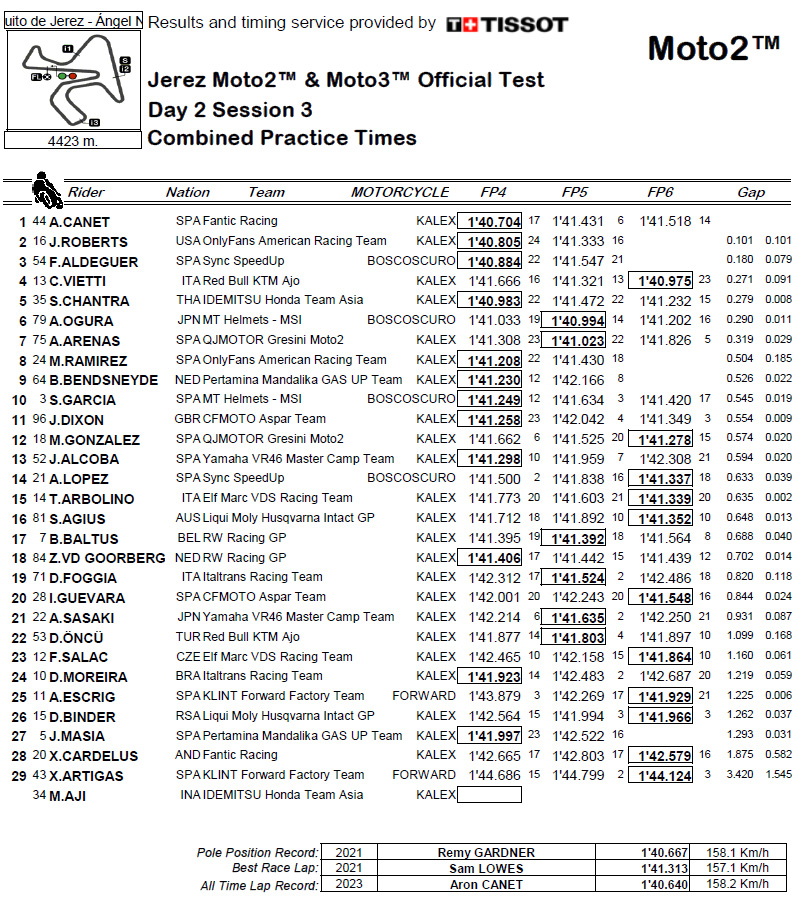 Aron Canet (Fantic Racing) a été le pilote à battre lors des deux premières journées en Andalousie, mais le temps de 1’40.704 de l’Espagnol a été battu le dernier jour, la plupart des pilotes y ayant établi leurs meilleurs tours personnels. Fermin Aldeguer a donc été le plus rapide du lot, mais les débats ont été serrés, l’Américain Joe Roberts (OnlyFans American Racing) n’étant qu’à 0,044s en P2, avec Manuel Gonzalez (QJMOTOR Gresini Moto2™) à 0,078s en troisième position. Fermin Aldeguer et Joe Roberts ont chuté le dernier jour, mais cela n’a pas beaucoup freiné leur progression, les trois premiers ayant tous réalisé leur meilleur tour lors de la dernière séance.