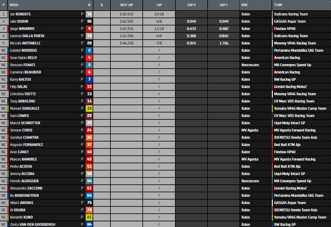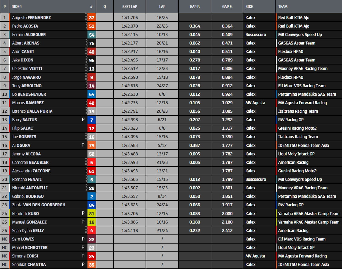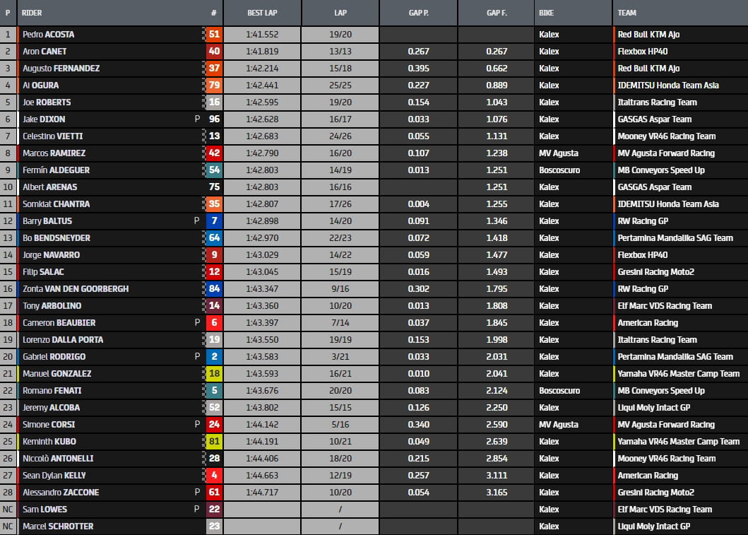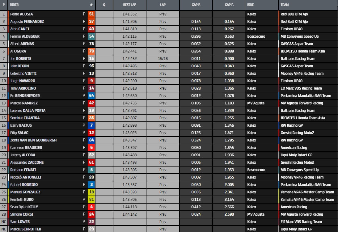 On repart là où nous nous sommes arrêtés : Pedro Acosta ne met pas longtemps à reprendre la première place, mais cette fois-ci plus loin du record qui vient d’être réécrit. Juste quelques millièmes derrière, son coéquipier Augusto Fernández, avec Arón Canet en 3ème position. Le top 3, comme on le voit ci-dessus, reste stable pendant un long moment jusqu’à ce que le #37 fasse une série de tours rapides qui lui valent la première place, le seul à descendre en dessous des 1’42 dans cette manche. Il est suivi par son compatriote Fermín Aldeguer et Albert Arenas, également dans le top 3, pour former un top 5 entièrement espagnol. Il y a également eu une multitude de chutes, à commencer par le duo de l’équipe Gresini (Salac a eu une double chute), suivi de Canet, Jeremy Alcoba, Gabriel Rodrigo, Zonta van den Goorbergh et Aldeguer.