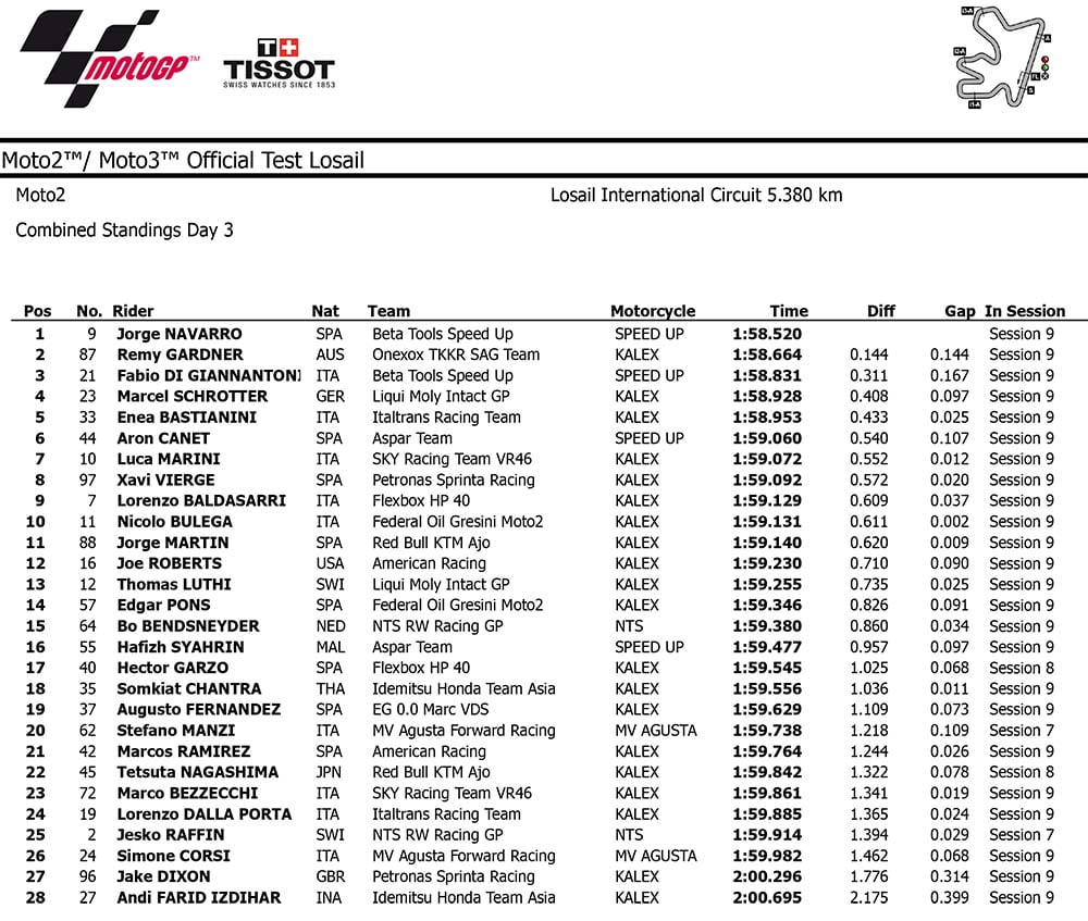 En 2e position, Remy Gardner, et en 4e position, Marcel Schrötter complètent la hiérarchie de tête devant Enea Bastianini, également à un haut niveau lors de ces tests hivernaux. On peut en dire autant de Luca Marini, 7e du jour devant Xavi Vierge et de Lorenzo Baldassarri comme de Nicolò Bulega.