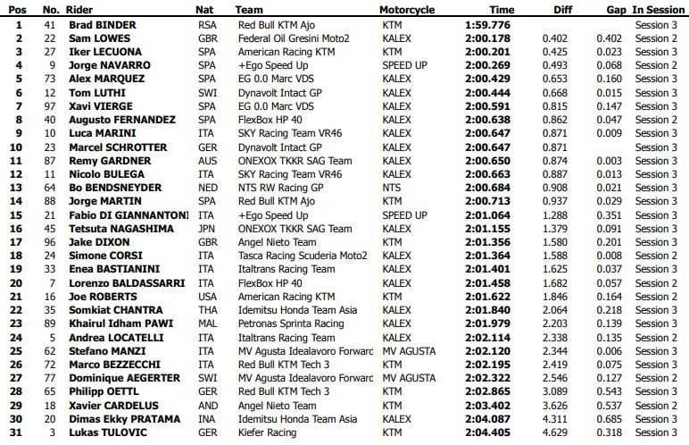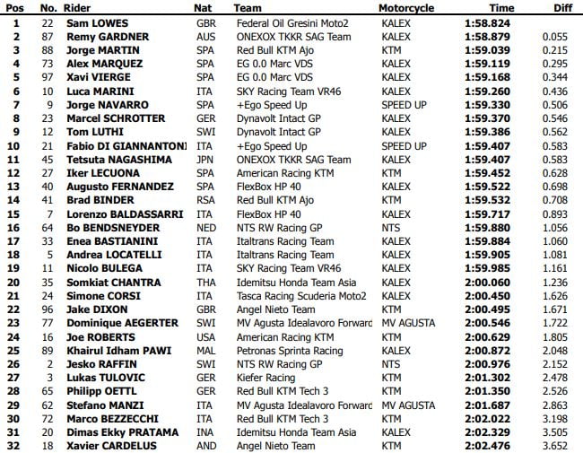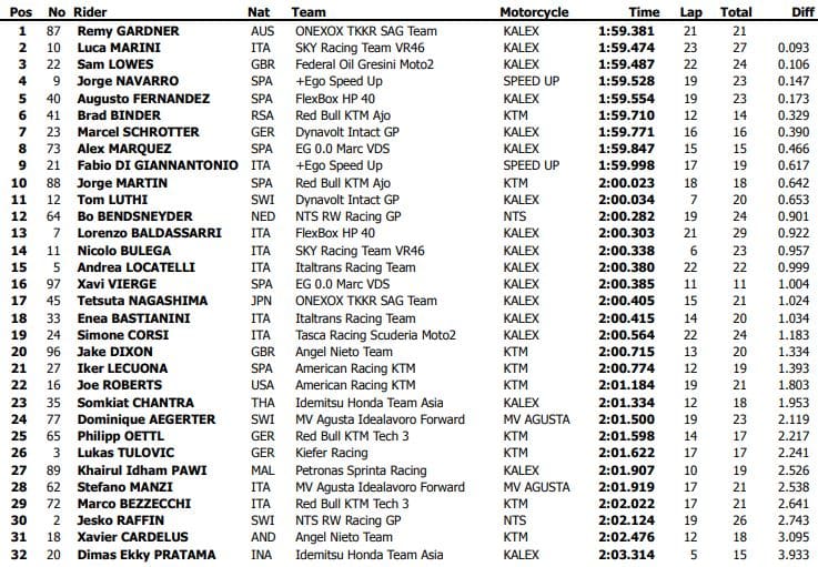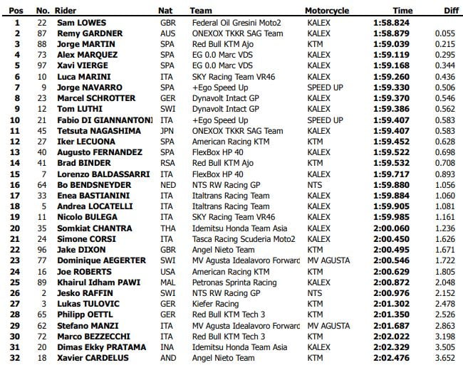 Mais le Britannique n’était pas le seul à passer sous 1’59 car Remy Gardner le rejoignait à 0.041 en 1’58.879. Luca Marini (Kalex, SKY Racing Team VR46) se classait troisième en 1’59.260, ce qui n’était pas extraordinaire dans l’absolu, mais confirmait que l’équipe Sky VR46 de Marini avait enfin réussi à régler ses problèmes techniques. Après des débuts difficiles, Marini s’était classé deuxième de la première séance entre Gardner et Lowes, alors qu’il était péniblement neuvième la veille, à 0.8 de Brad Binder.