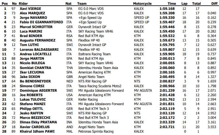 Xavi Vierge conservait finalement la première position devant son équipier Álex Márquez, puis dans le dernier tour Jorge Navarro (Speed Up, +Ego Speed Up) se hissait en troisième position devant Fabio di Giannantonio, Marcel Schrötter, Luca Marini et Brad Binder, le leader de la veille.