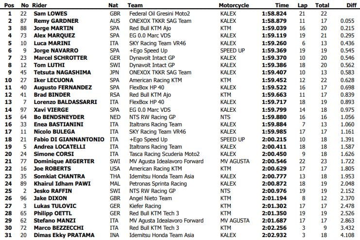 Le temps à améliorer était le 1’59.776 établi la veille par Brad Binder. Sam Lowes (Kalex, Federal Oil Gresini Moto2) plantait la première banderille en 2’00.134. Tom Lüthi (Kalex, Dynavolt Intact GP) passait ensuite en 2’00.122. Remy Gardner (Kalex, Onebox TKKR SAG Team) réalisait finalement le meilleur temps en 1’59.381 et l’Australien s’imposait avec 0.093 sur Luca Marini (Kalex, SKY Racing Team VR46), tandis que Sam Lowes complétait le tiercé de tête.