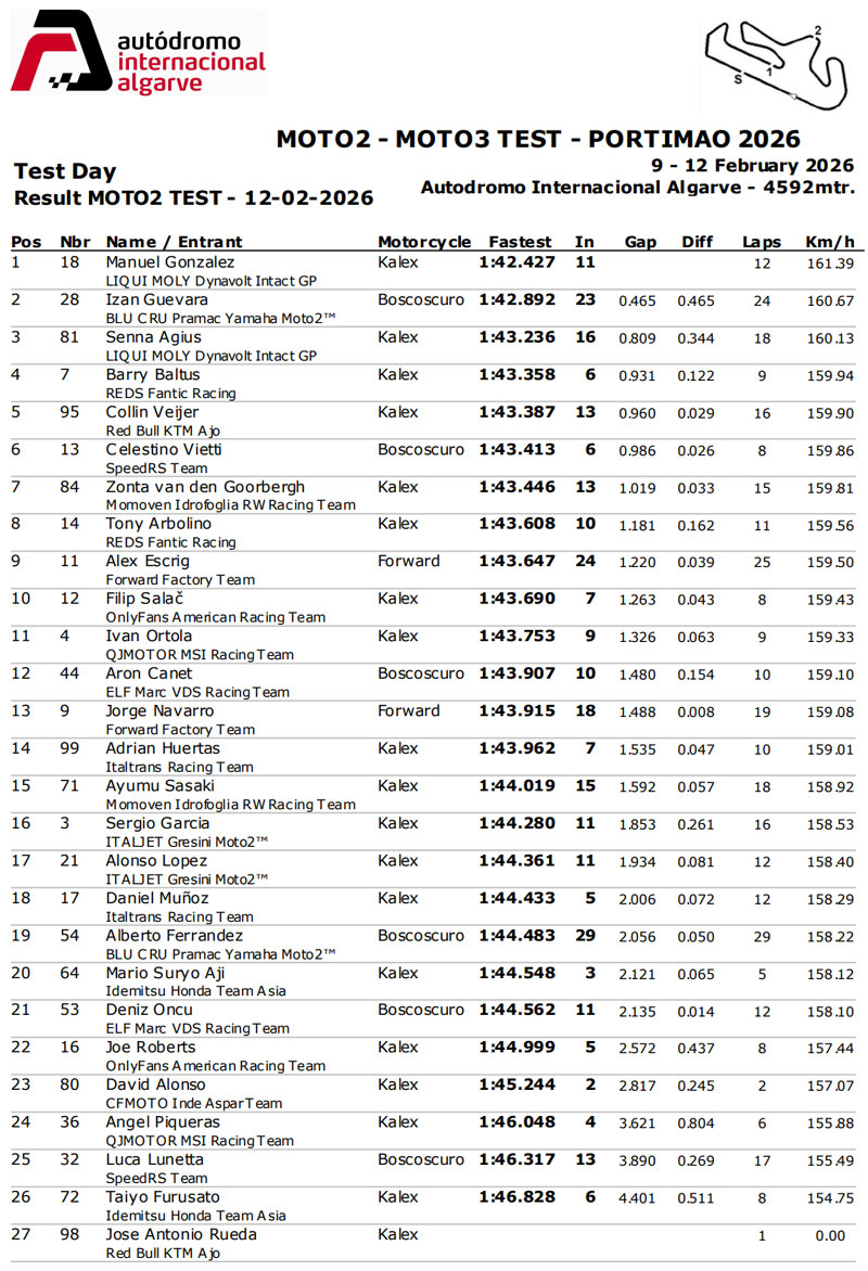 Au final, peu de tours ont donc été réalisés lors de cette dernière journée au Portugal, le pilote le plus assidu s’avérant être le coéquipier d’Alex Escrig, Alberto Ferrandez (BLU  RU Pramac Yamaha Moto2™) avec 29 tours enregistrés.