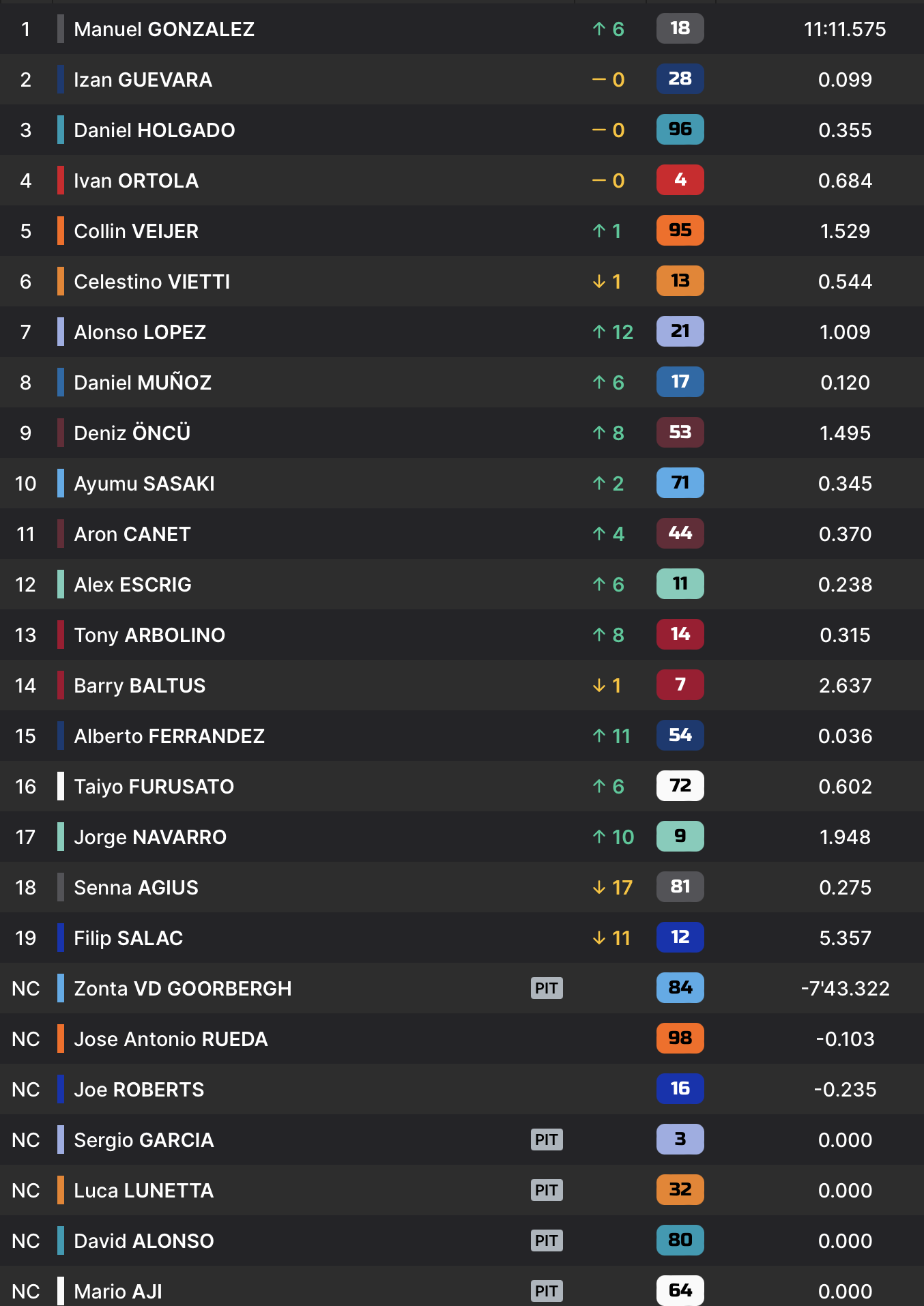 Manuel Gonzalez tente sa chance sur Izan Guevara peu avant l’entame du dernier tour, et le passe. Si son adversaire résiste, c’est bien le vice-champion du monde 2025 qui franchit le drapeau à damier le premier. Daniel Holgado, légèrement revenu sur le duo de tête dans le dernier tour, complète le podium.