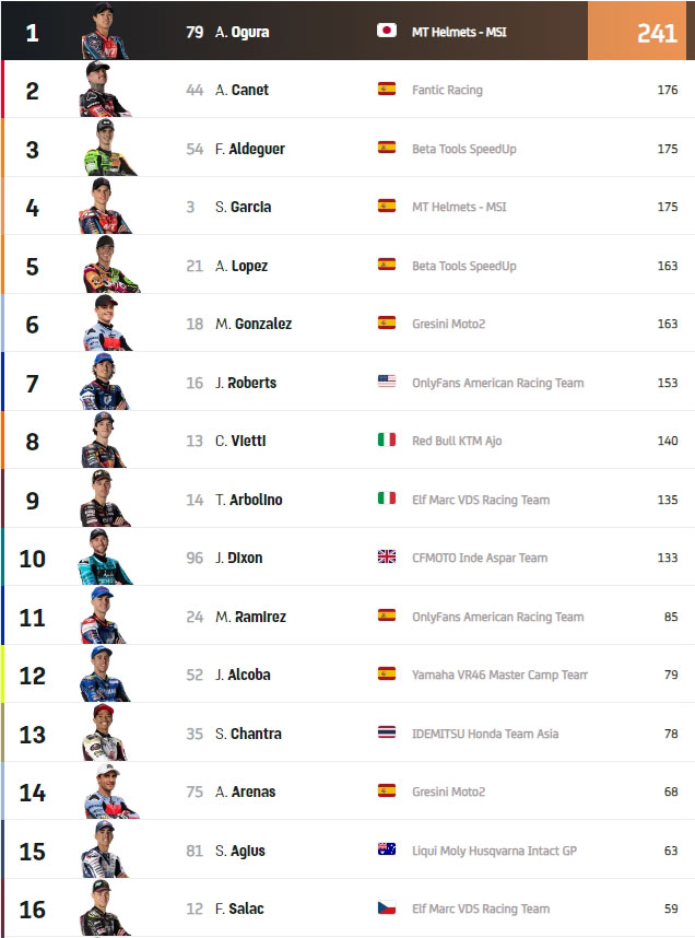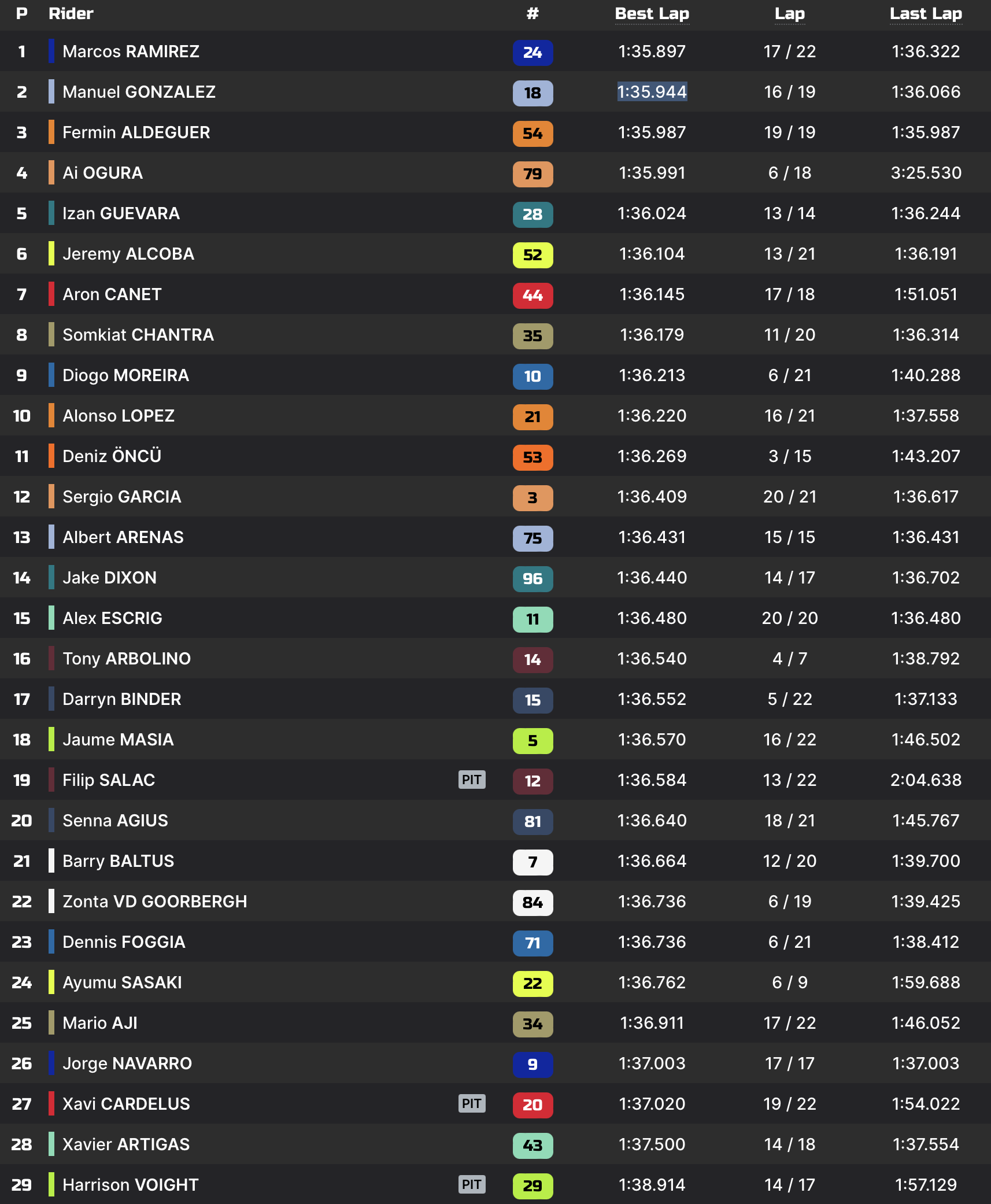 Fermin Aldeguer éjectera finalement Ai Ogura du top-3, pour figer le classement aux avant-postes. Aron Canet se classe septième de la FP, Sergio Garcia douzième.